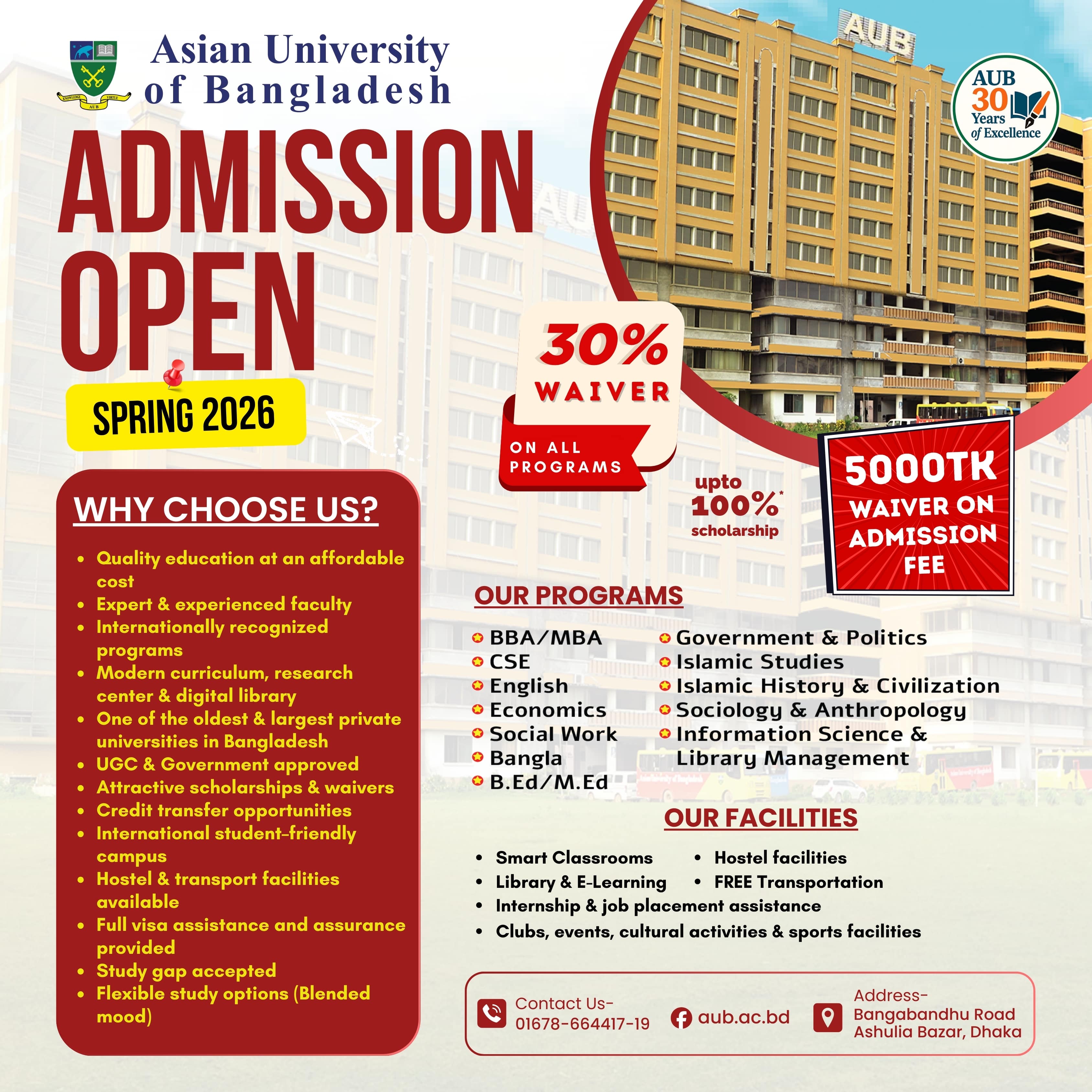 We are welcoming foreign and local students for obtaining higher education for graduates and undergraduate programs ensuring quality education at affordable cost at the Asian University of Bangladesh.