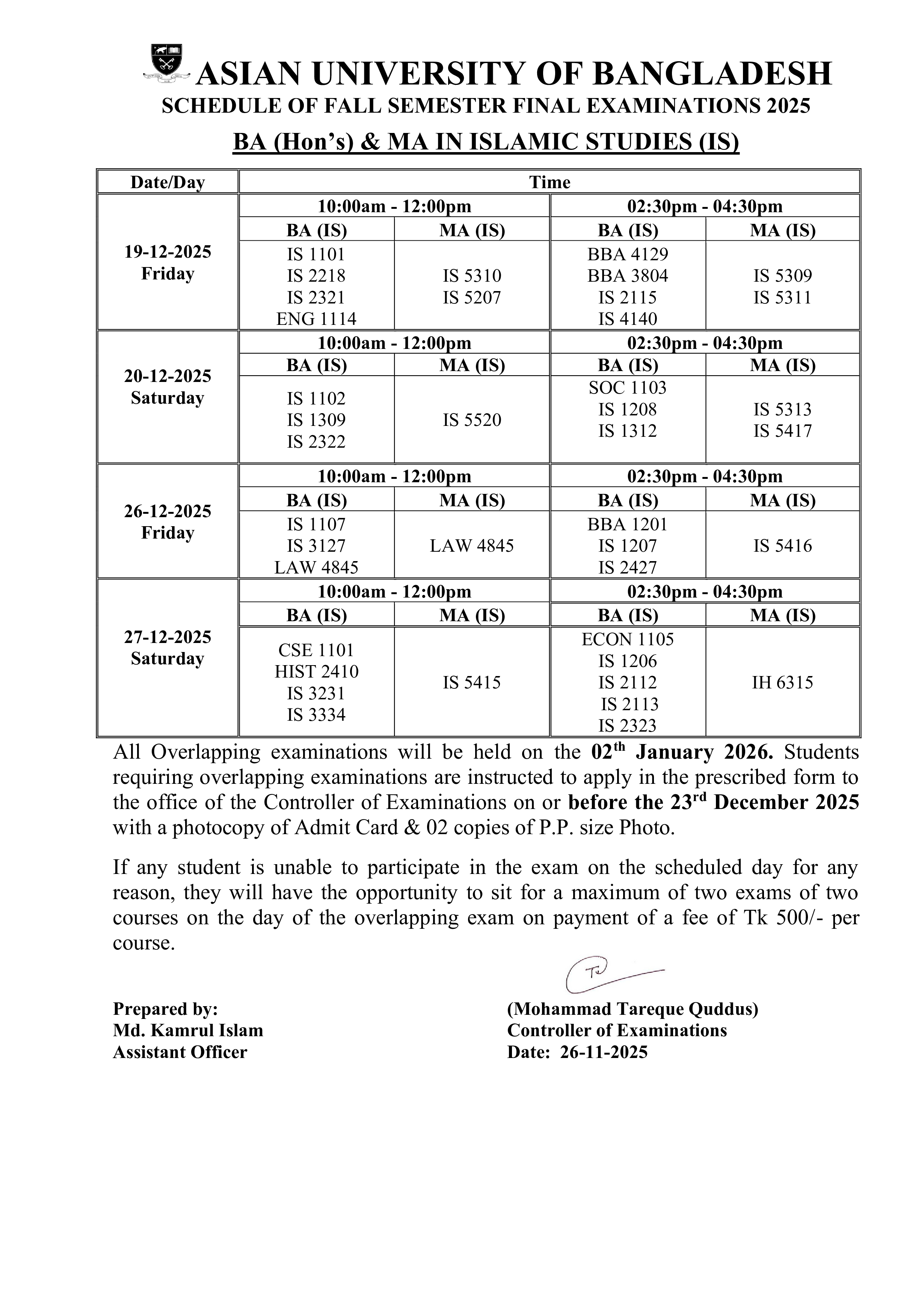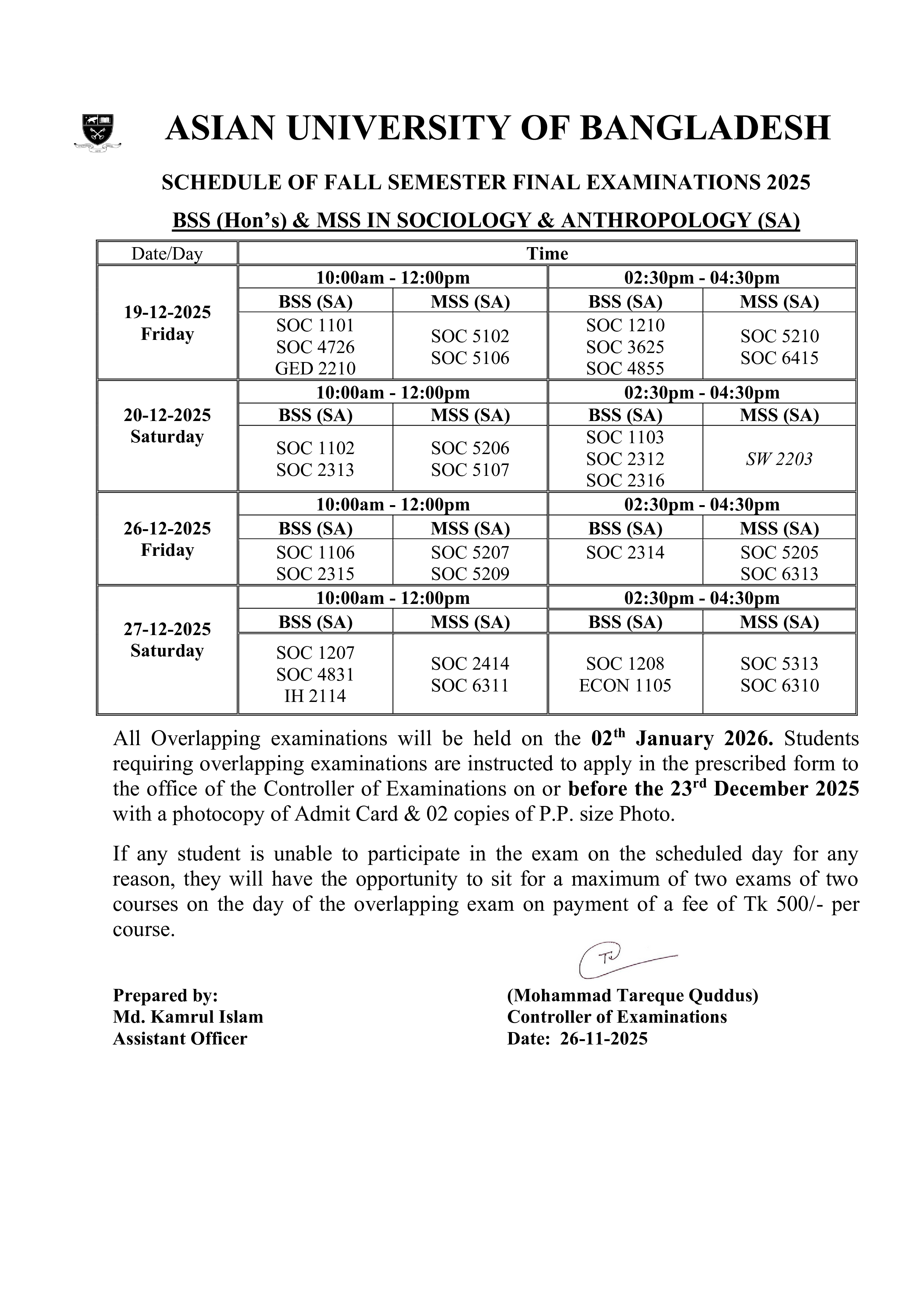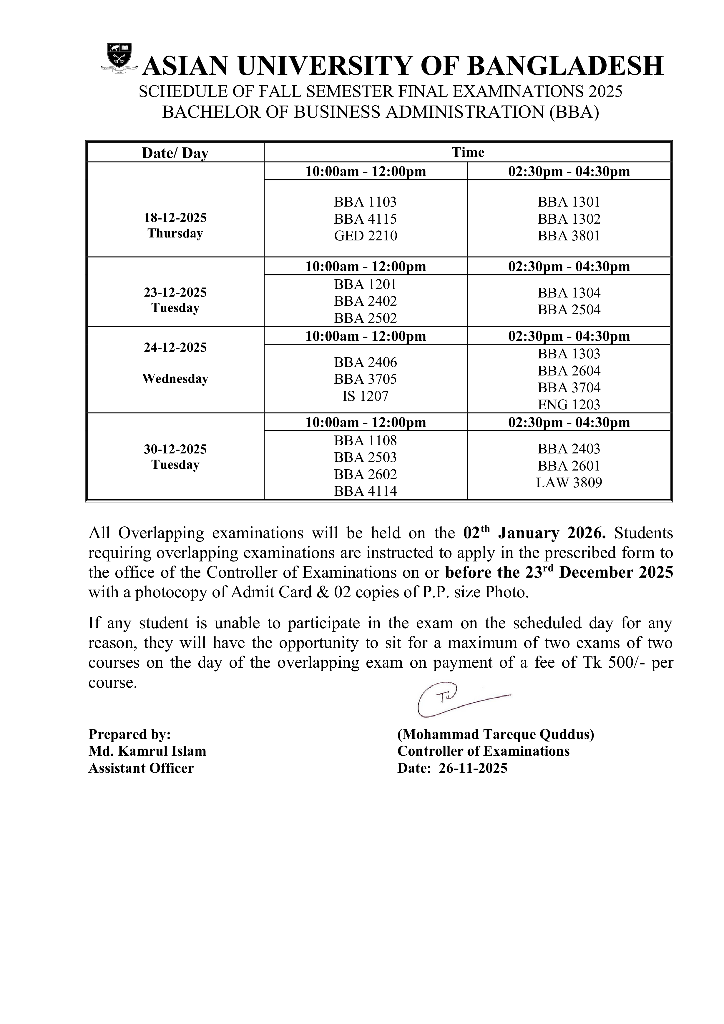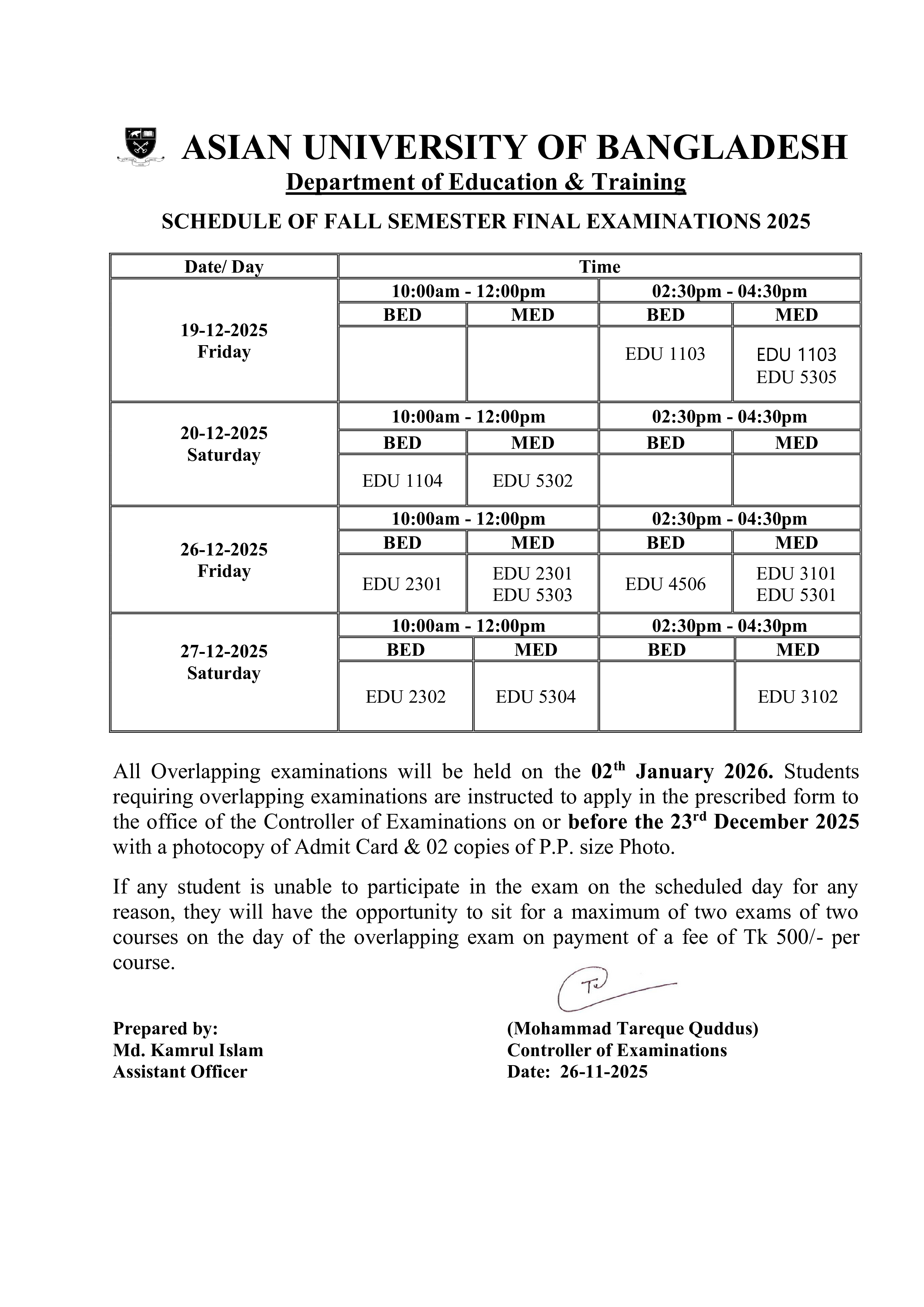 Fall 2025 Semester Final Exam Routine