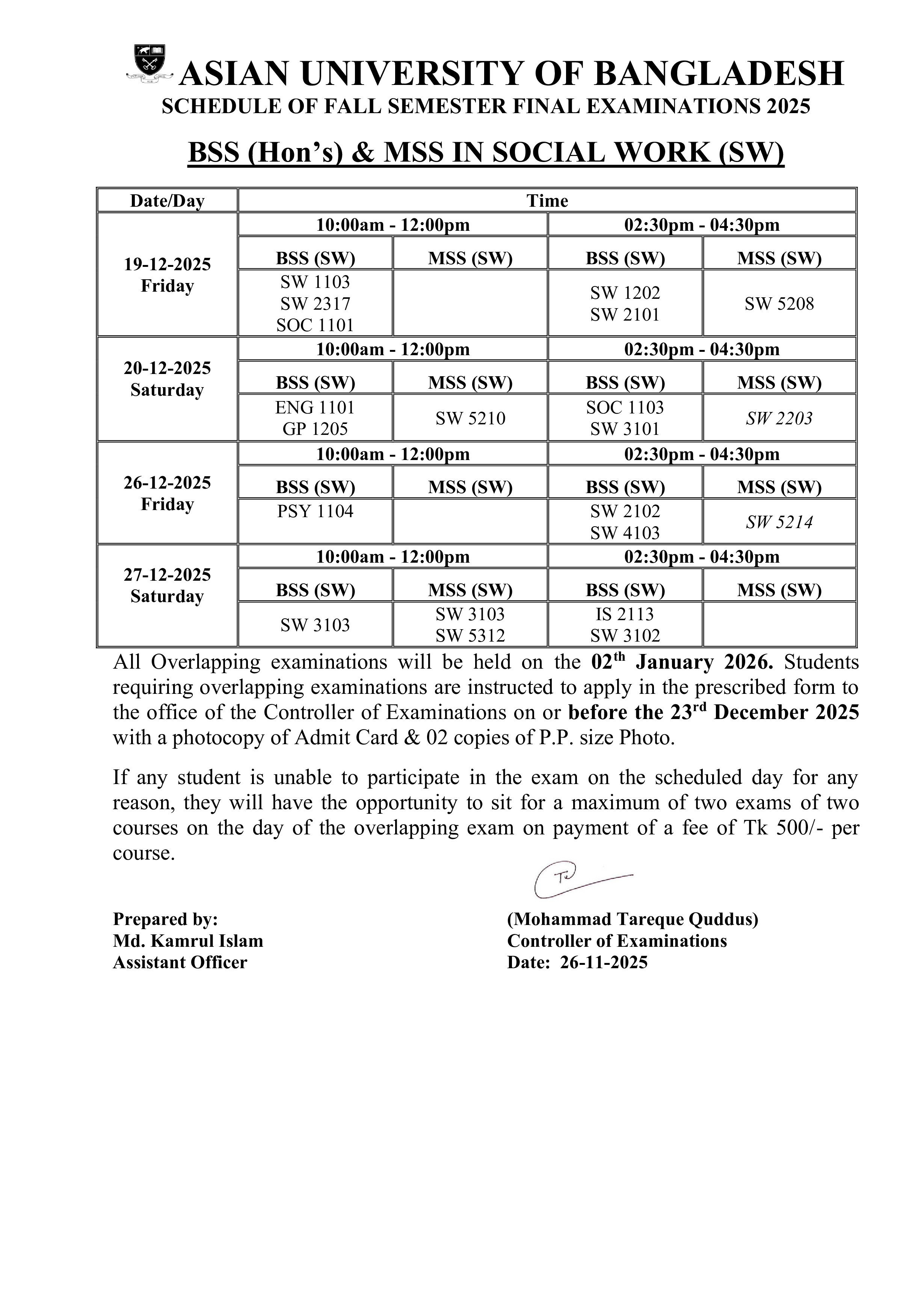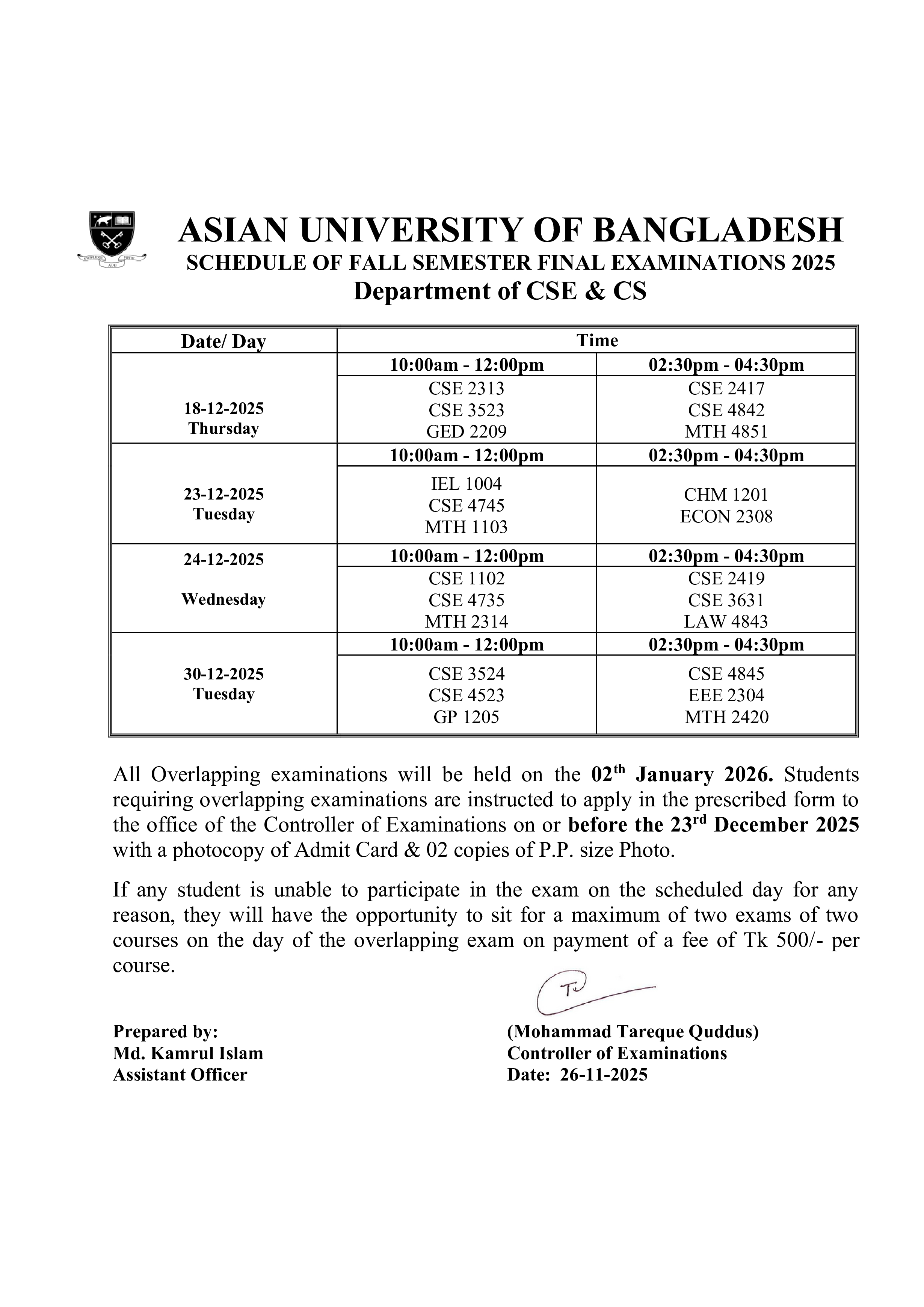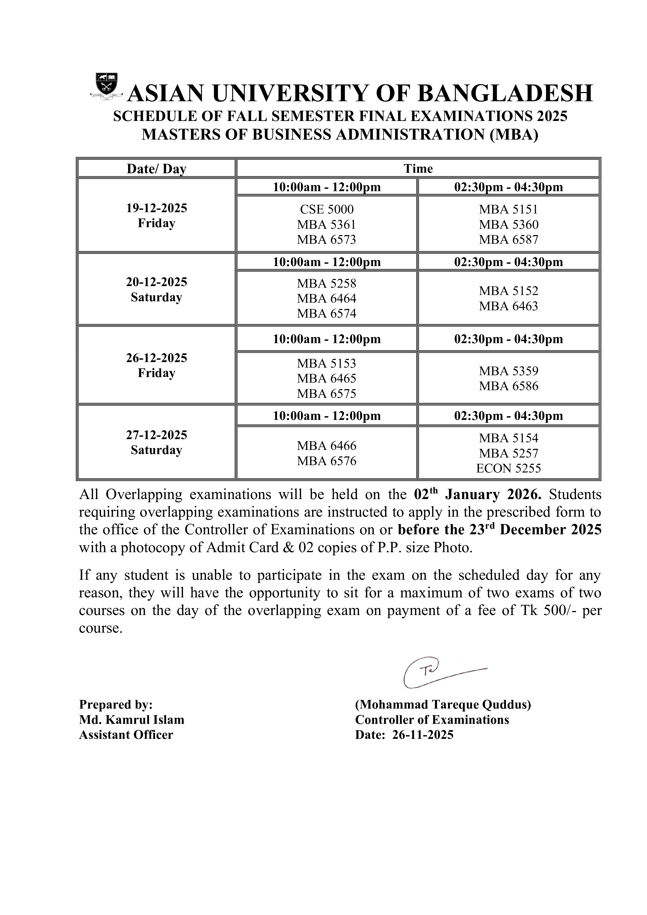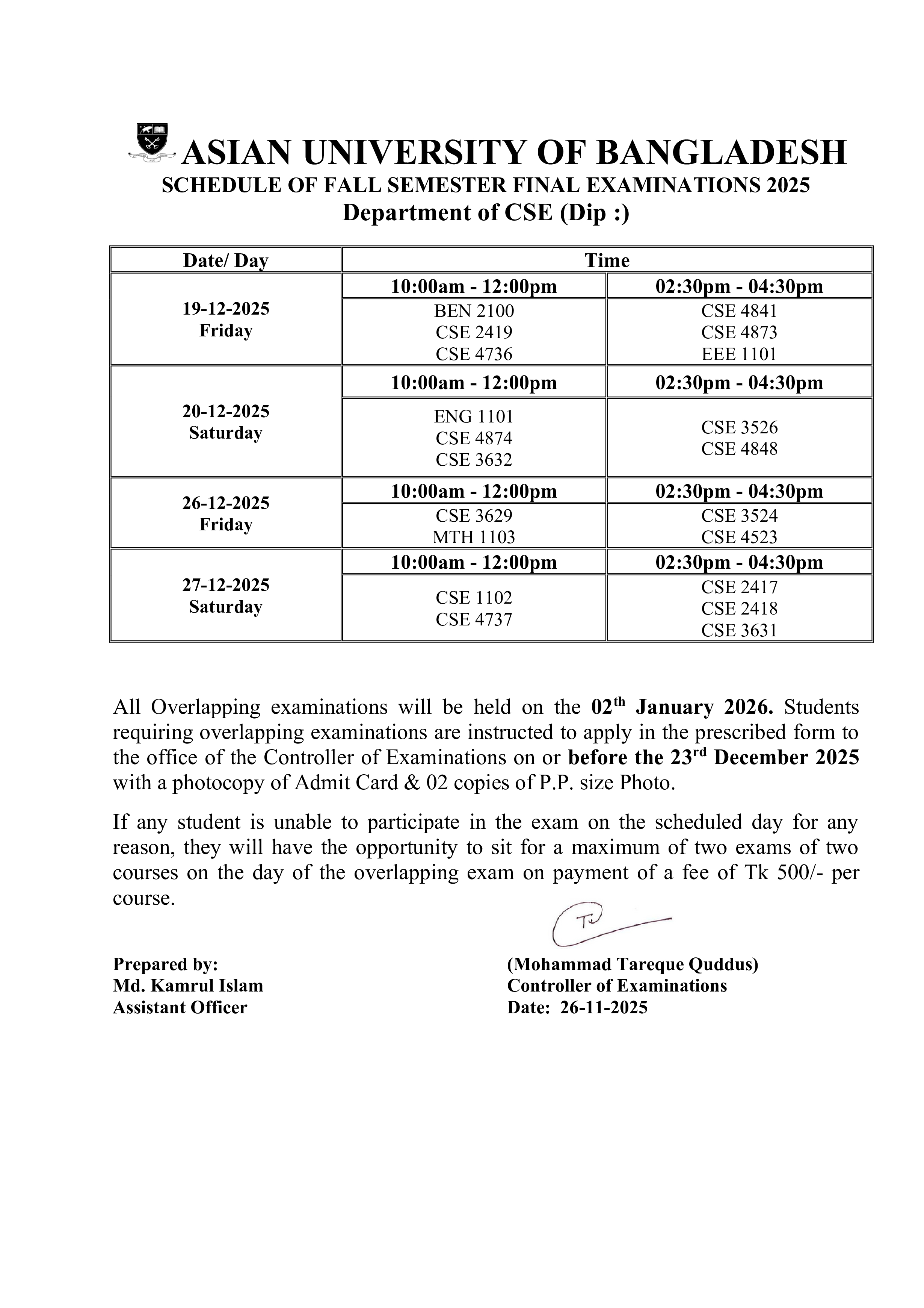 Fall 2025 Semester Final Exam Routine