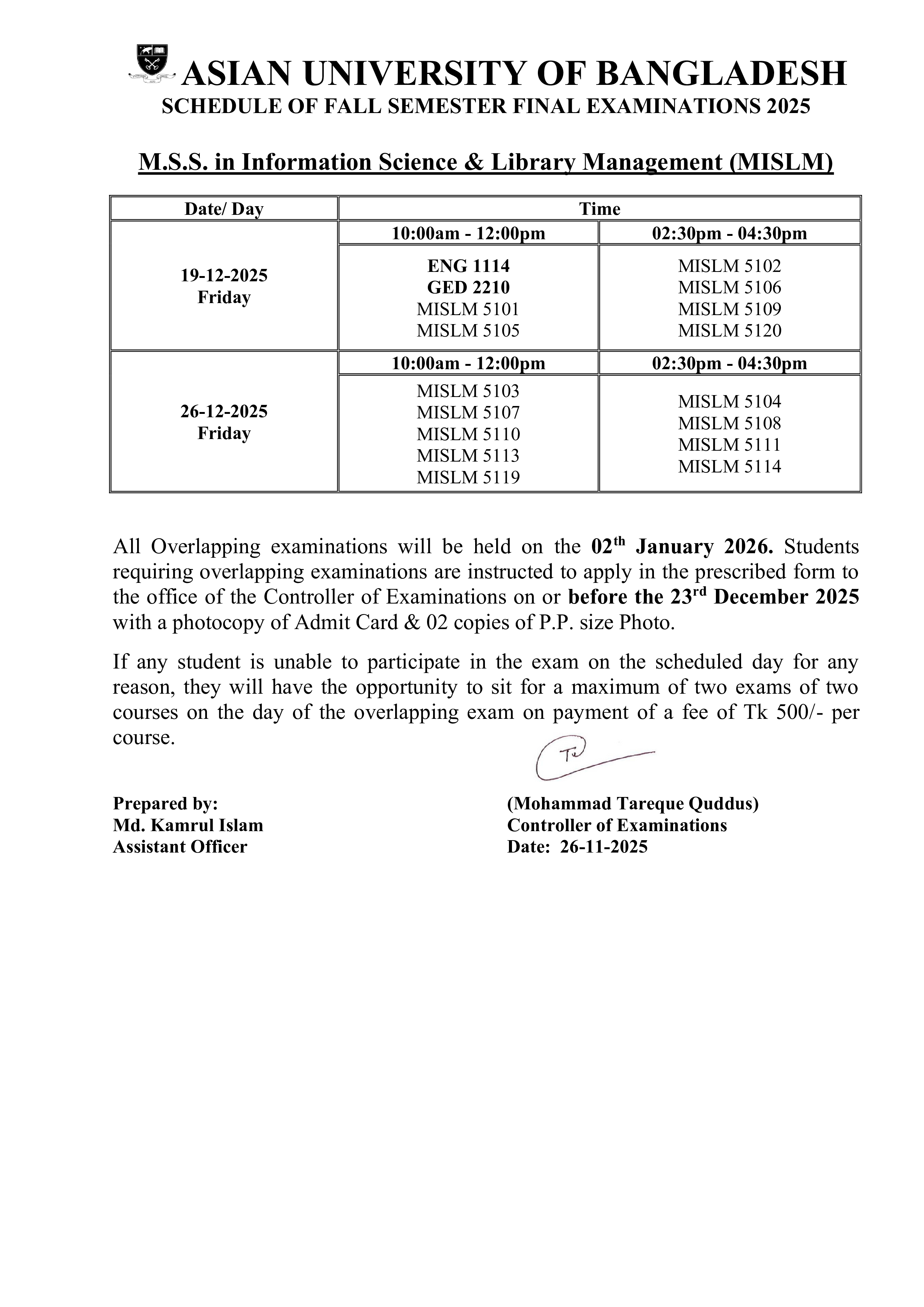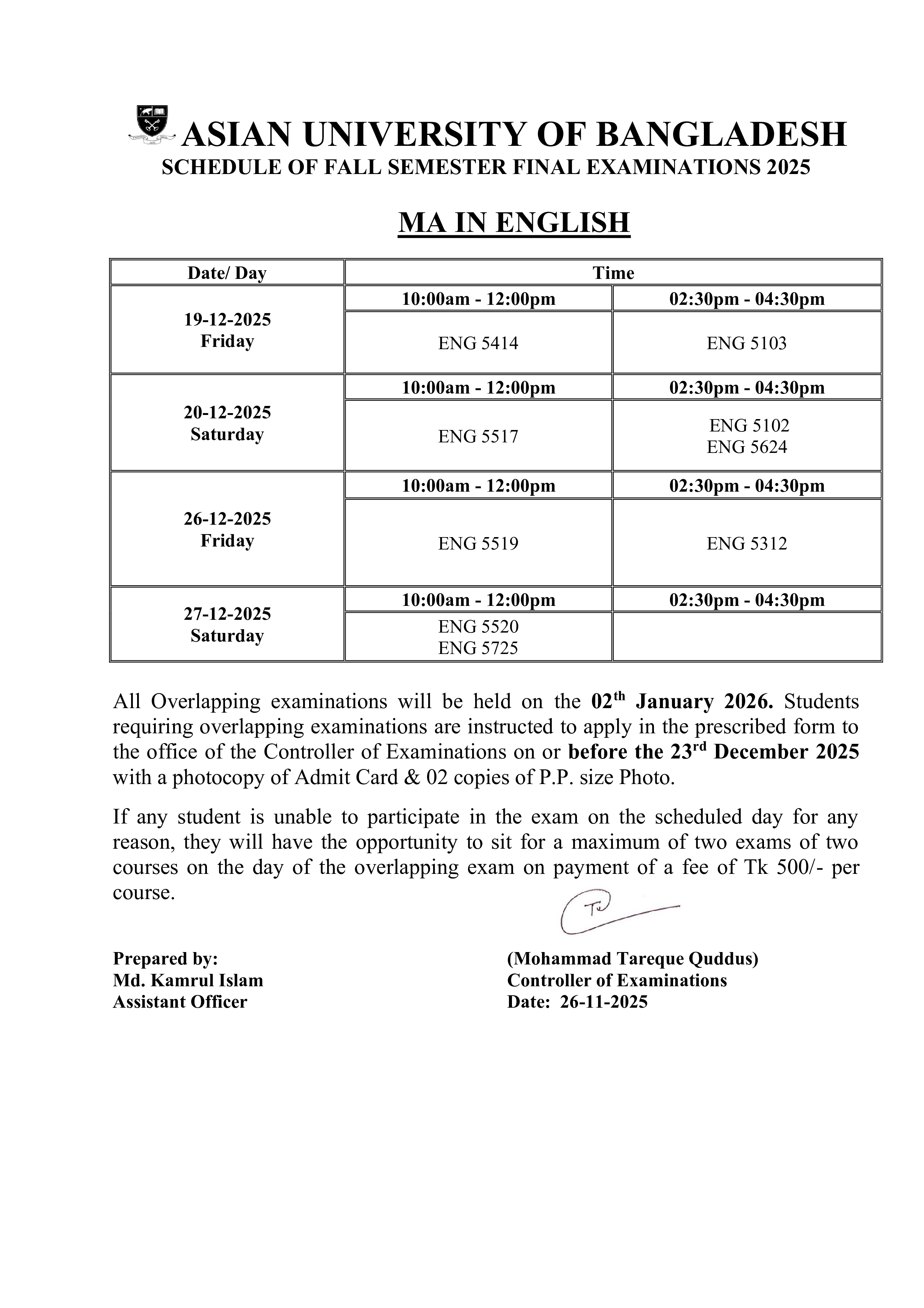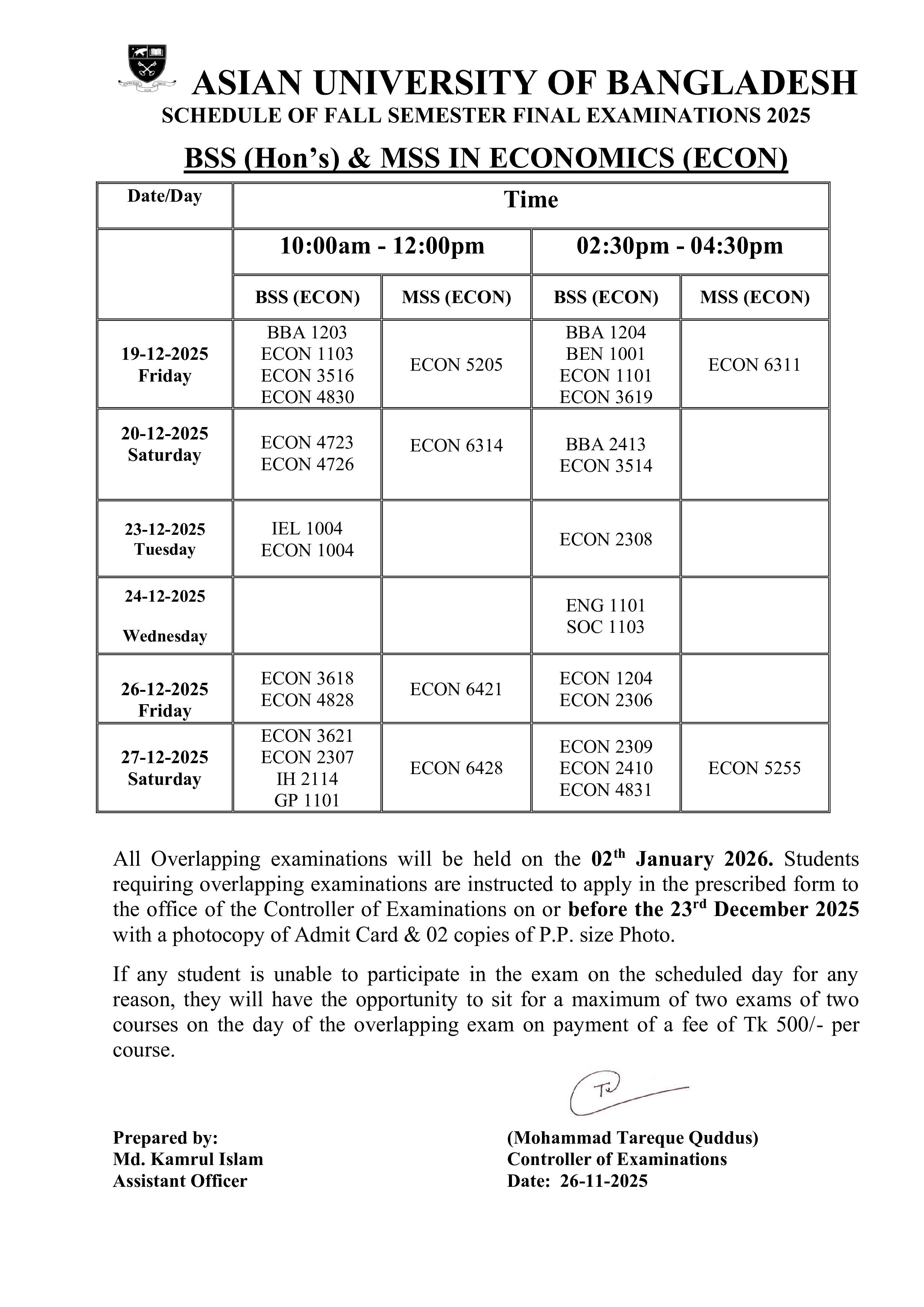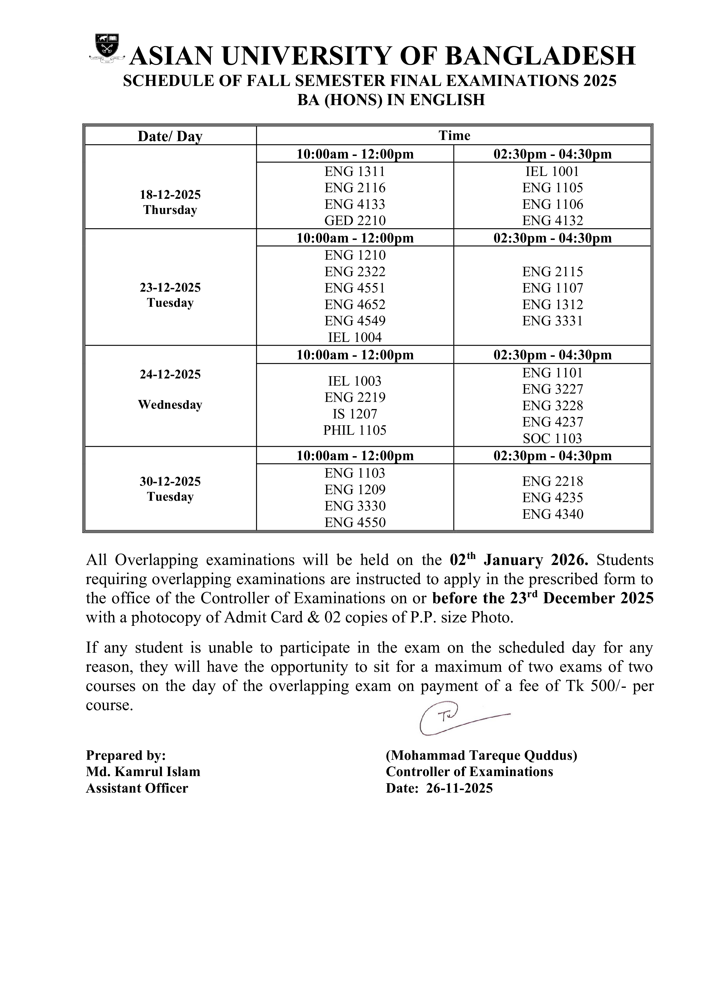 Fall 2025 Semester Final Exam Routine